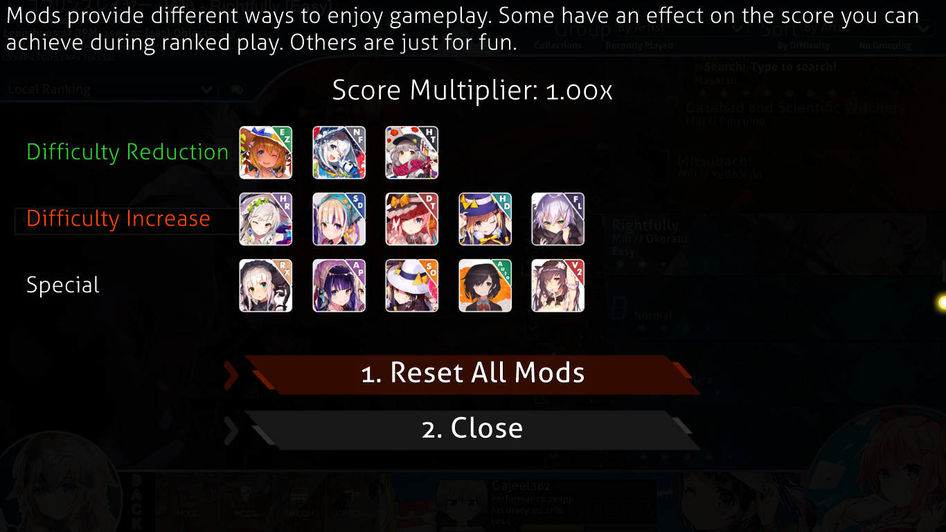You can add Mods to your game in the selecting the Mods icon in the bottom bar. You can challenge yourself by speeding up the game or take it easy by reducing the health takeaway. If you're not happy with the mods you added you can always just click the "Reset All Mods" button. Mods can also be used as an advantage when playing with others to make your score go higher by increasing the difficulty. You can mess around with the mods for fun and also add an automated mod which basically plays the game for you but you cannot use it when playing with others because, of course, that would be cheating. But just go ahead and mess around with the mods. The more you mess with it, the more you understand it.
